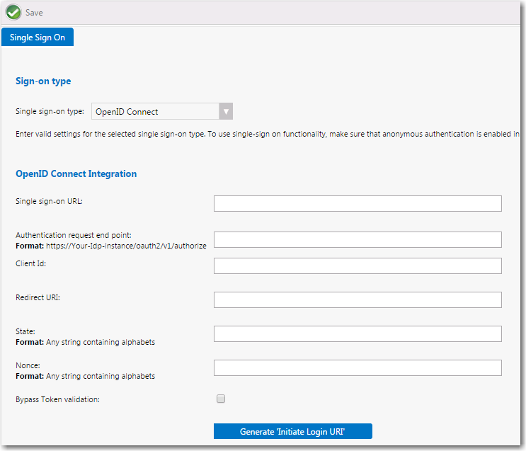 - From the Single sign-on type list, select OpenID Connect . The OpenID Connect settings are listed.