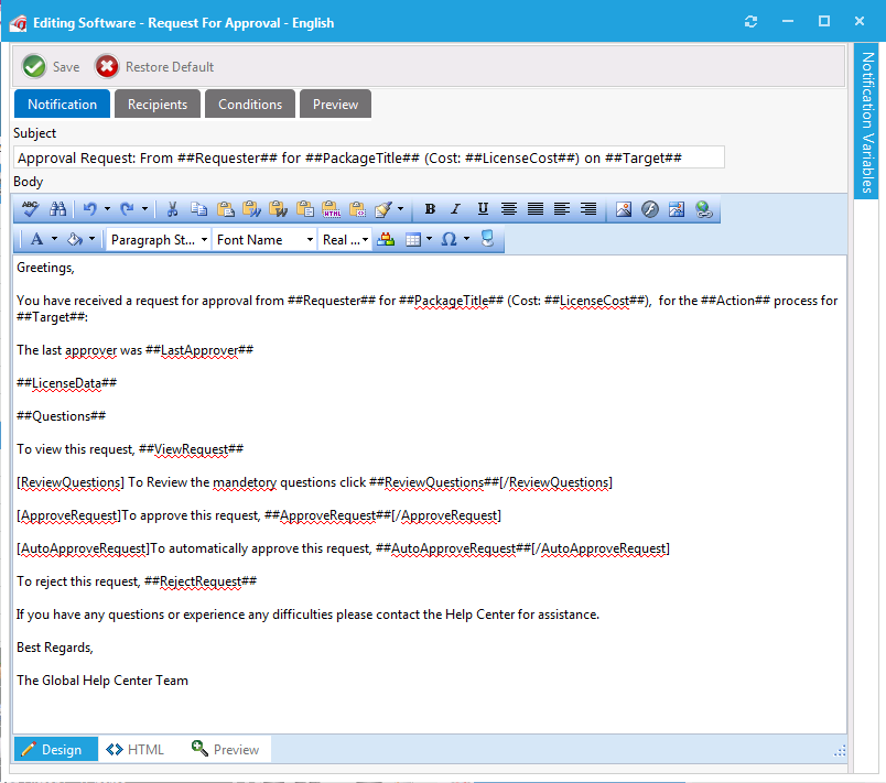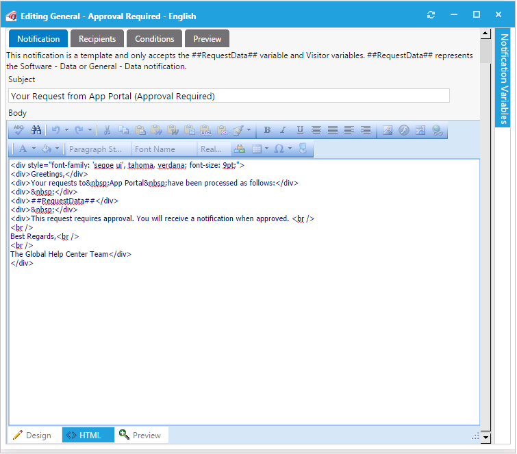 5. To insert a variable into the email, click on the Notification Variables button on the right side of the dialog box to open the Notification Variables dialog box, select a variable from the list, and click Add .